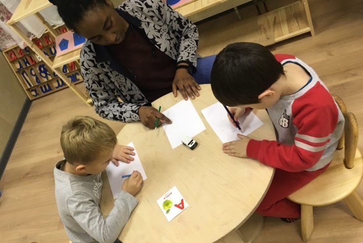 Studying in different thematic zones of Montessori classes children sing songs in English, make crafts from clay or plasticine, sculpt animals, build houses, cars, geometric shapes, etc. and the teacher calls all actions and names of subjects in English language.